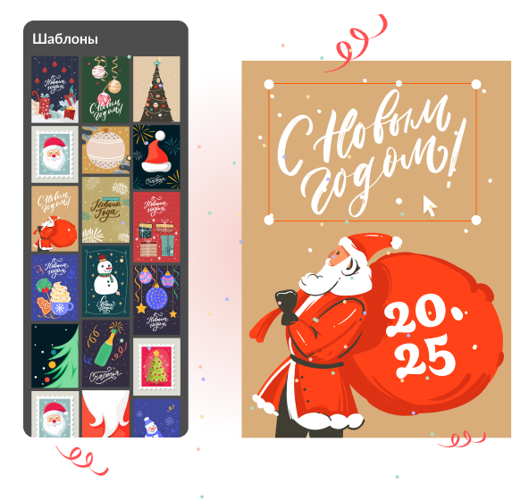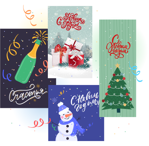 Выбирайте из праздничных шаблонов открыток, эффектных шрифтов и